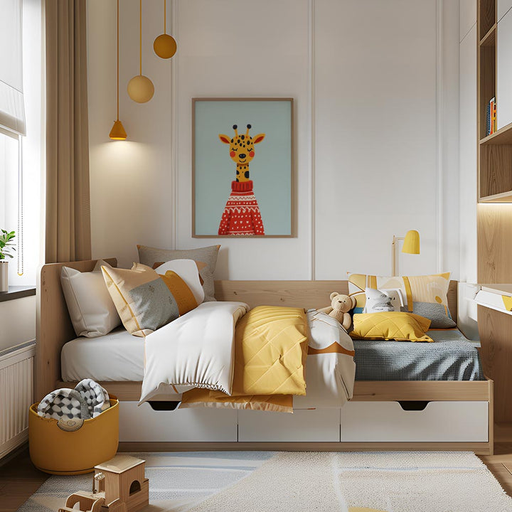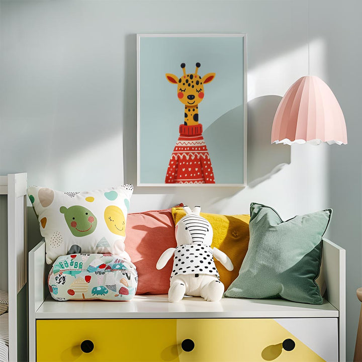 Transform any room into a charming sanctuary with the Cozy Giraffe wall art print. Featuring an adorable giraffe donning a cozy jumper, this print adds a touch of warmth and cuteness to your space. Made with high-quality materials, this print is sure to delight any animal lover.