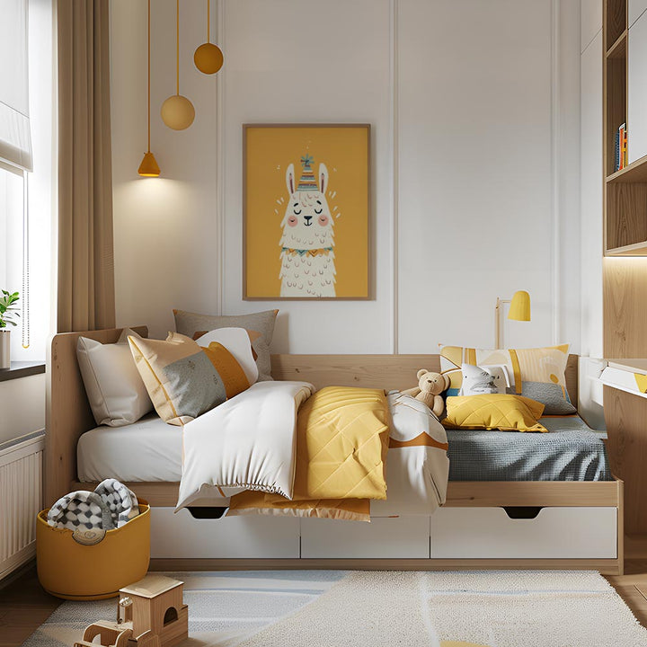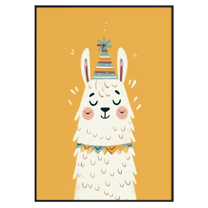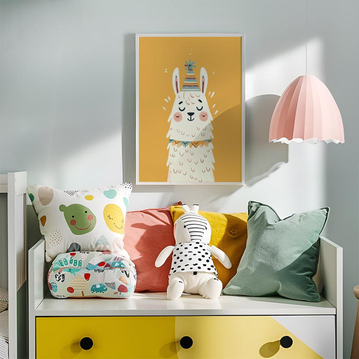 Add a touch of festive cheer to any room with our adorable Festive Llama wall art print. This illustration features a cute llama wearing a party hat, bringing a smile to your face. Perfect for a fun and whimsical decor, this print will brighten up any space.