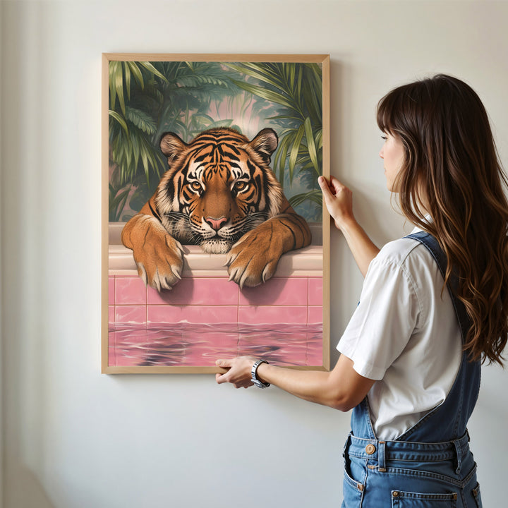 Make a fierce statement with Tiger at the Pink Pool, a striking wall art print that blends wild nature with retro glamour. Featuring a majestic tiger lounging poolside against a backdrop of tropical foliage and rosy tilework, this piece fuses bold elegance with surreal charm. Perfect for eclectic interiors, maximalist decor, or anyone who loves art with personality and a wink of attitude.