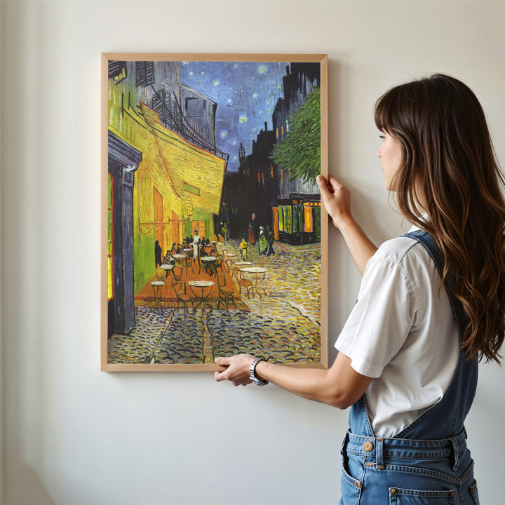 Step into the magic of a starlit evening with this captivating wall art print of Vincent van Gogh’s Café Terrace at Night. Painted in 1888, this masterpiece combines vibrant color, dynamic brushwork, and the dreamy glow of gaslight to capture a charming street scene in Arles, France. The rich contrast between the golden café and deep indigo night sky makes this piece an unforgettable addition to any space.
